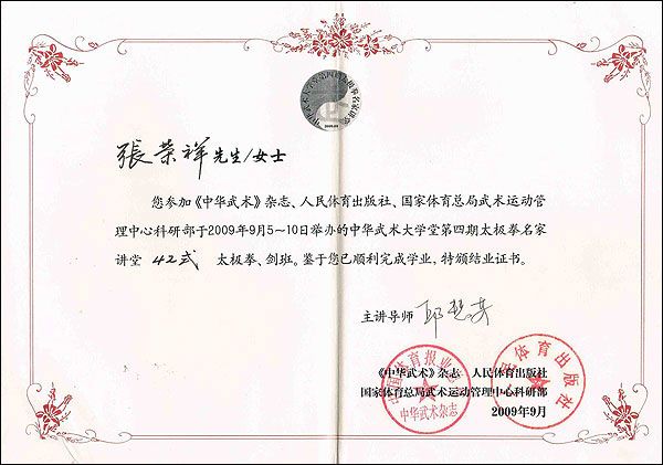 我是奔着邱慧芳老师的名气报名参加中华武术大学堂太极拳名家讲堂42式太极拳、42式太极剑班的。经过短短五天的培训,使我受益匪浅,收获颇丰。邱慧芳老师对太极拳真谛的独到领悟,她的深厚的技术功底和生动的语言表达能力,她的点面结合,深入浅出的教学方法,她在身体极度不适的情况下坚持站着给大家讲课、坚持给大家做示范的敬业精神,给我们留下了难忘的印象.